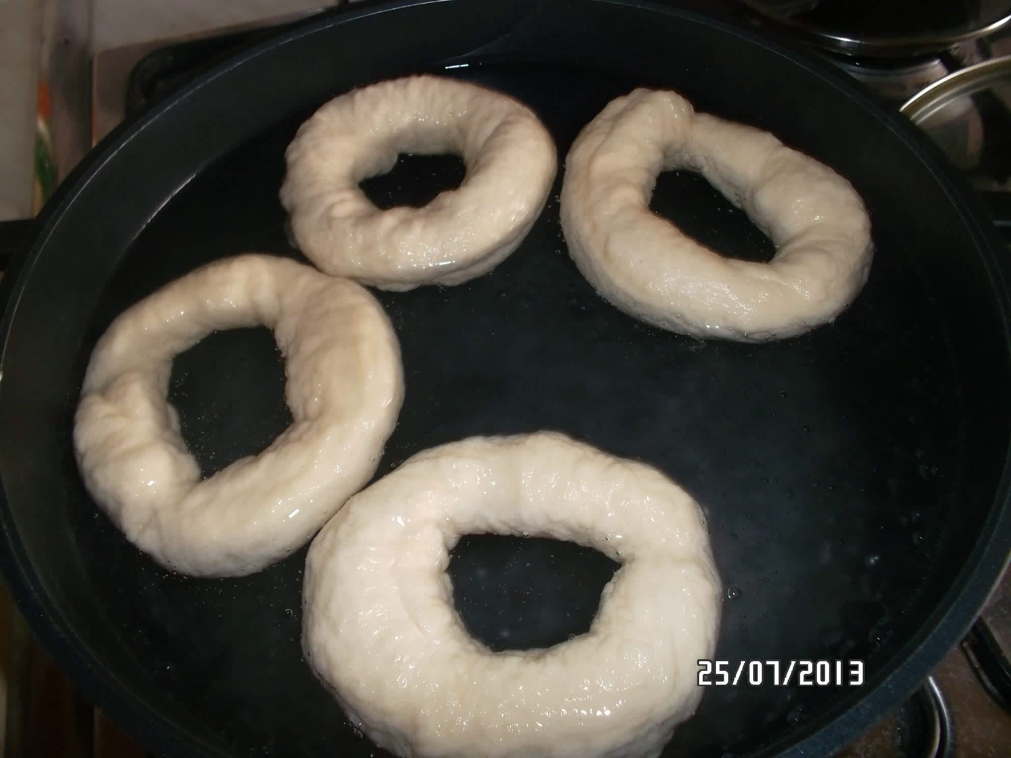 Jakmile voda vaří, bagely po pár kouskách do ní dáme a vaříme na každé straně cca 3/4 minuty