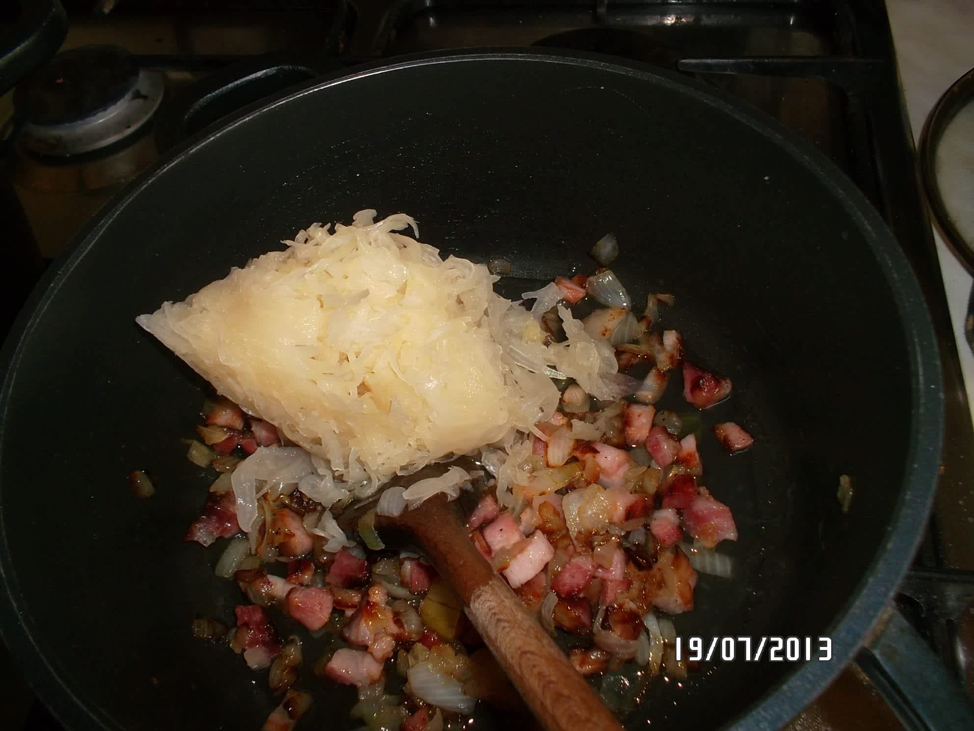 V jiným hrnci si osmažím cibuli a slaninu, jakmile je osmaženo, tak přisypu kysaný zelí a nechám oteplit