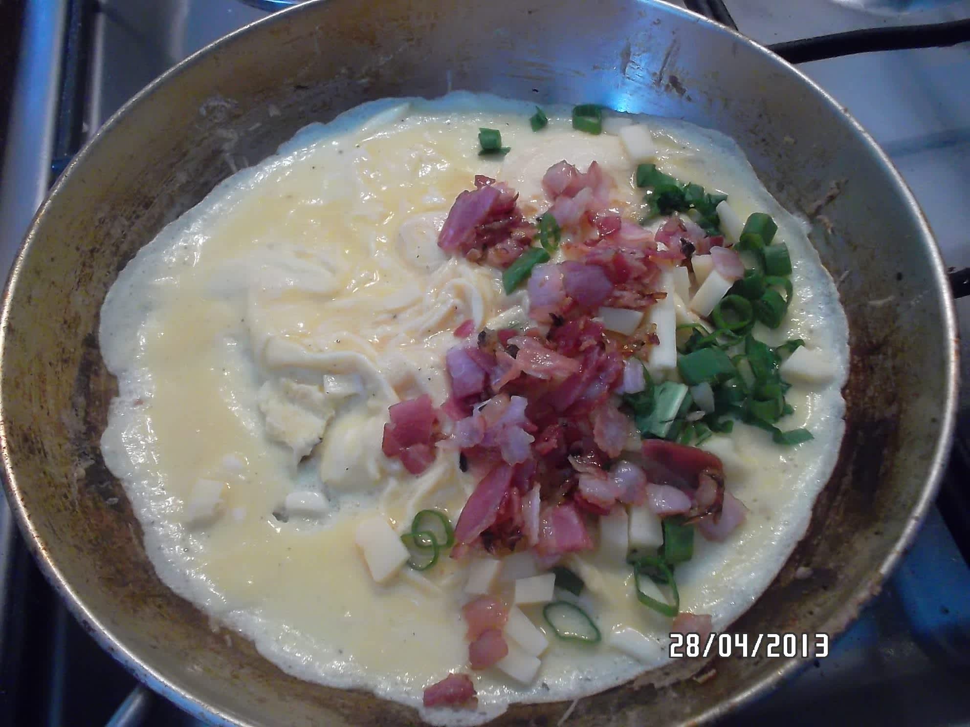 Na omeletu, která vypadá jakoby byla hotová asi z poloviny nandáme směs, zasypeme sýrem.