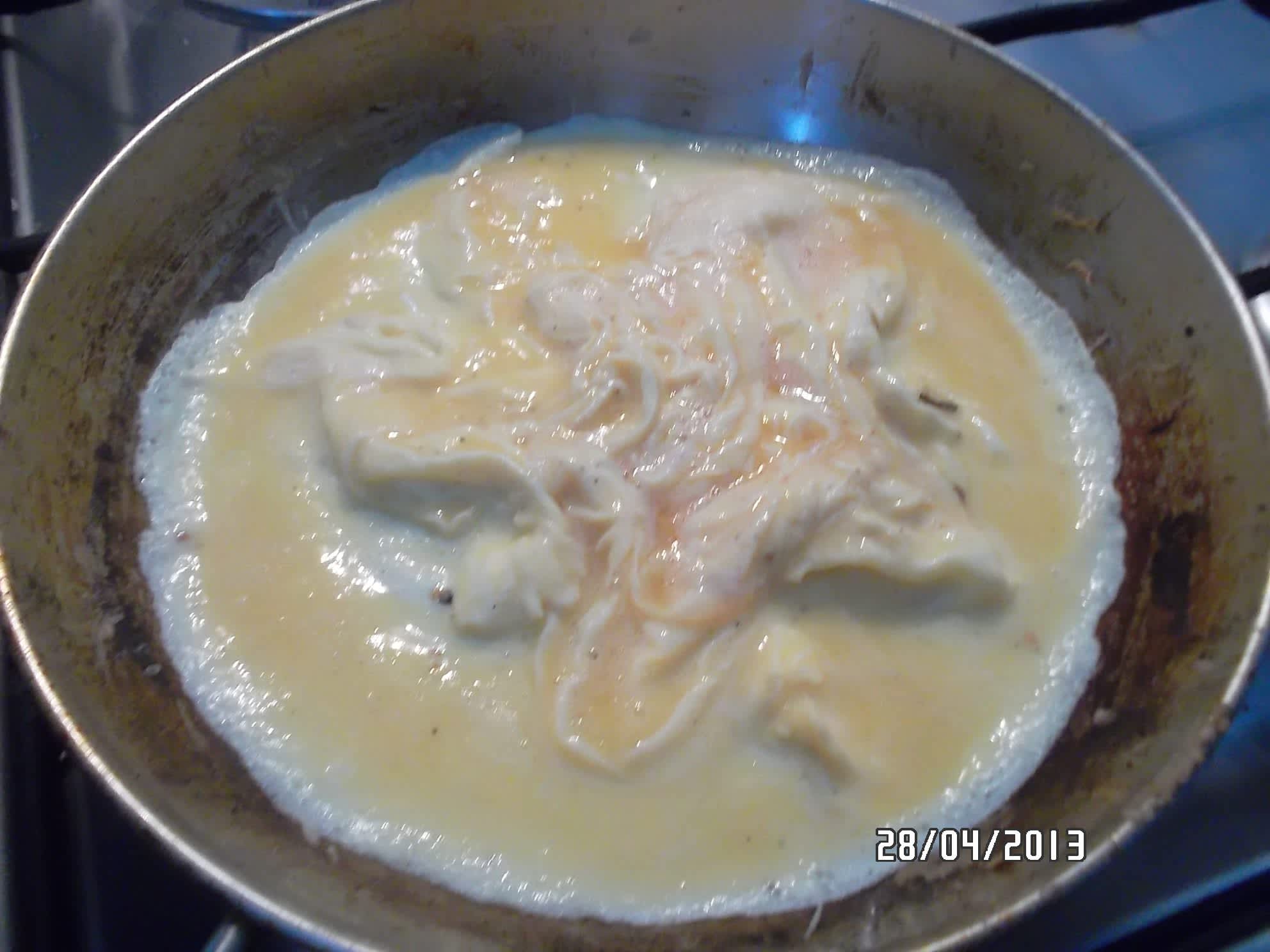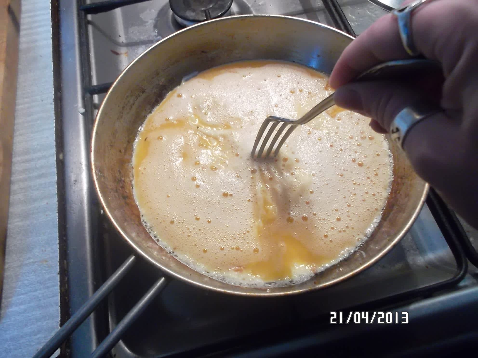 a nalijeme vajíčka, které rychle začneme shrnovat do středu pánve.