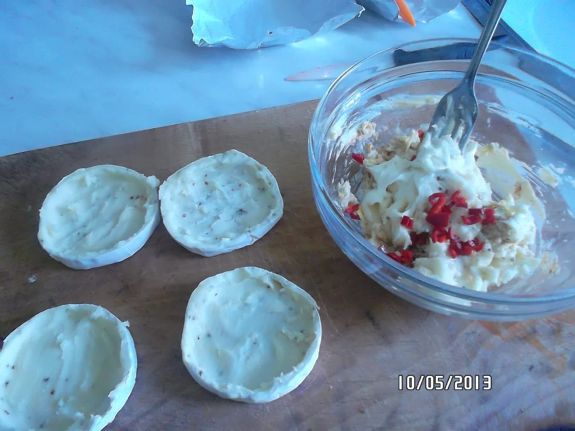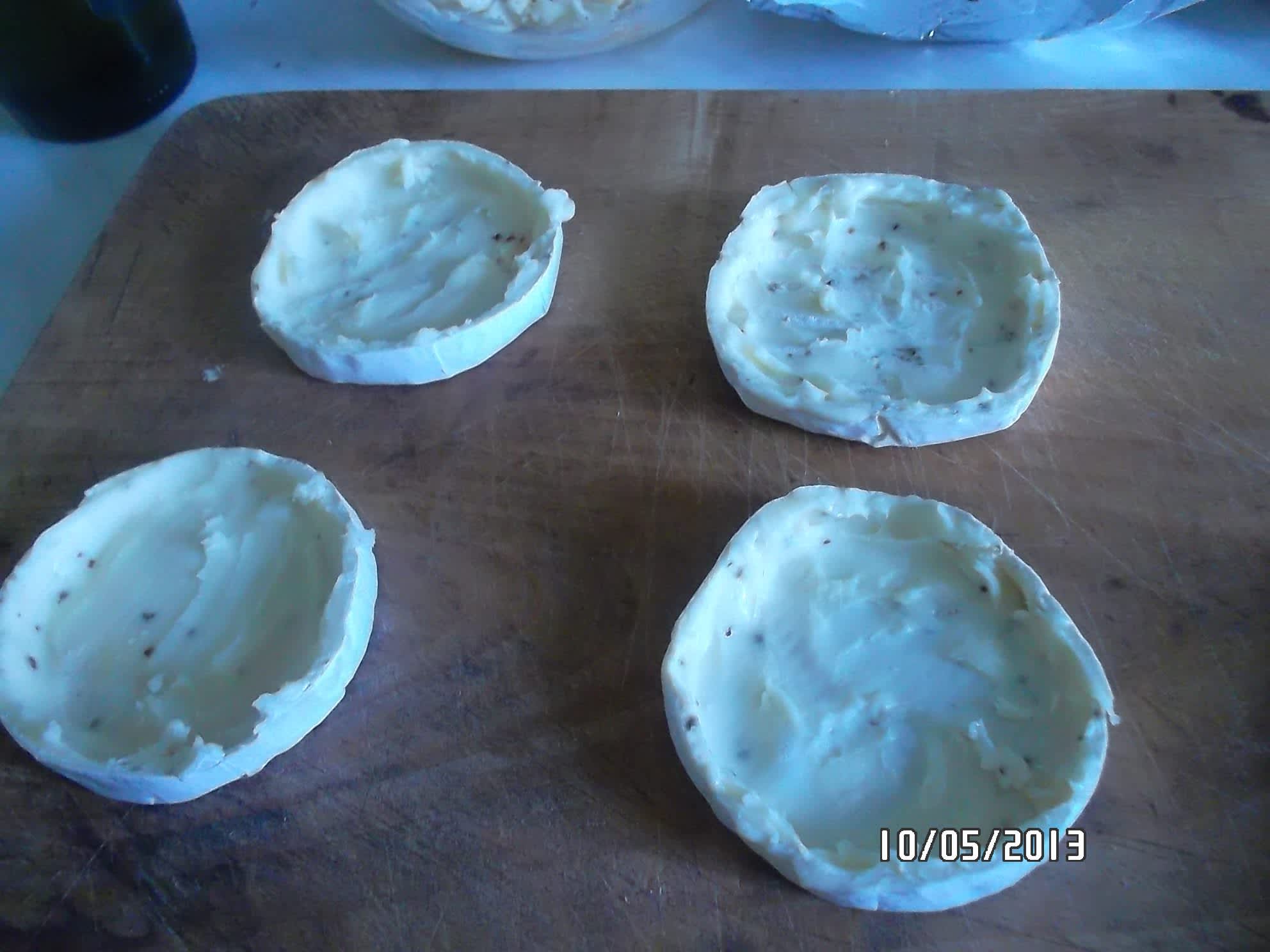 Hermelíny vybalíme z obalu :-D, rozpůlíme a lžičkou co nejlépe vydlabeme a hodíme k máslu.