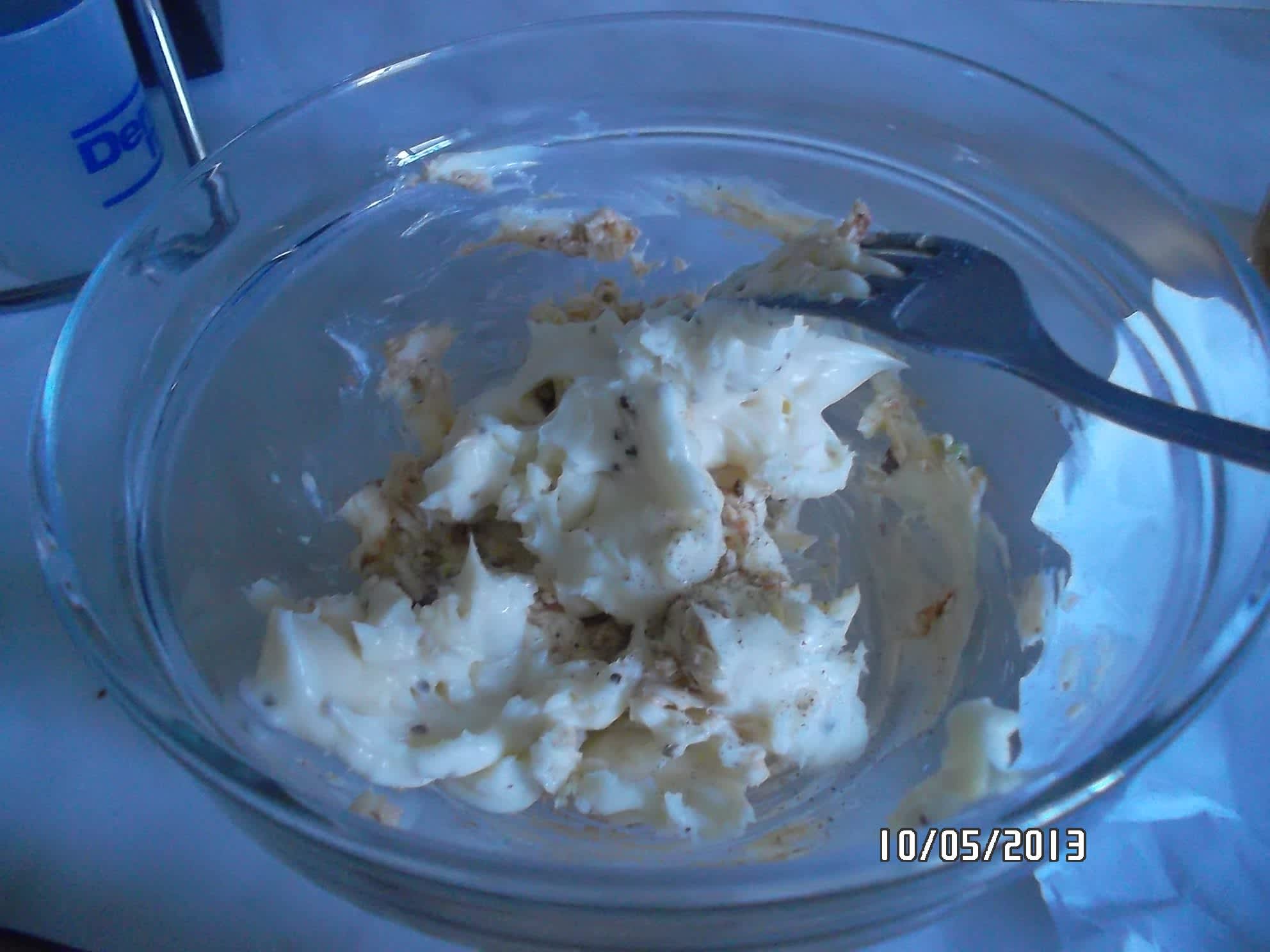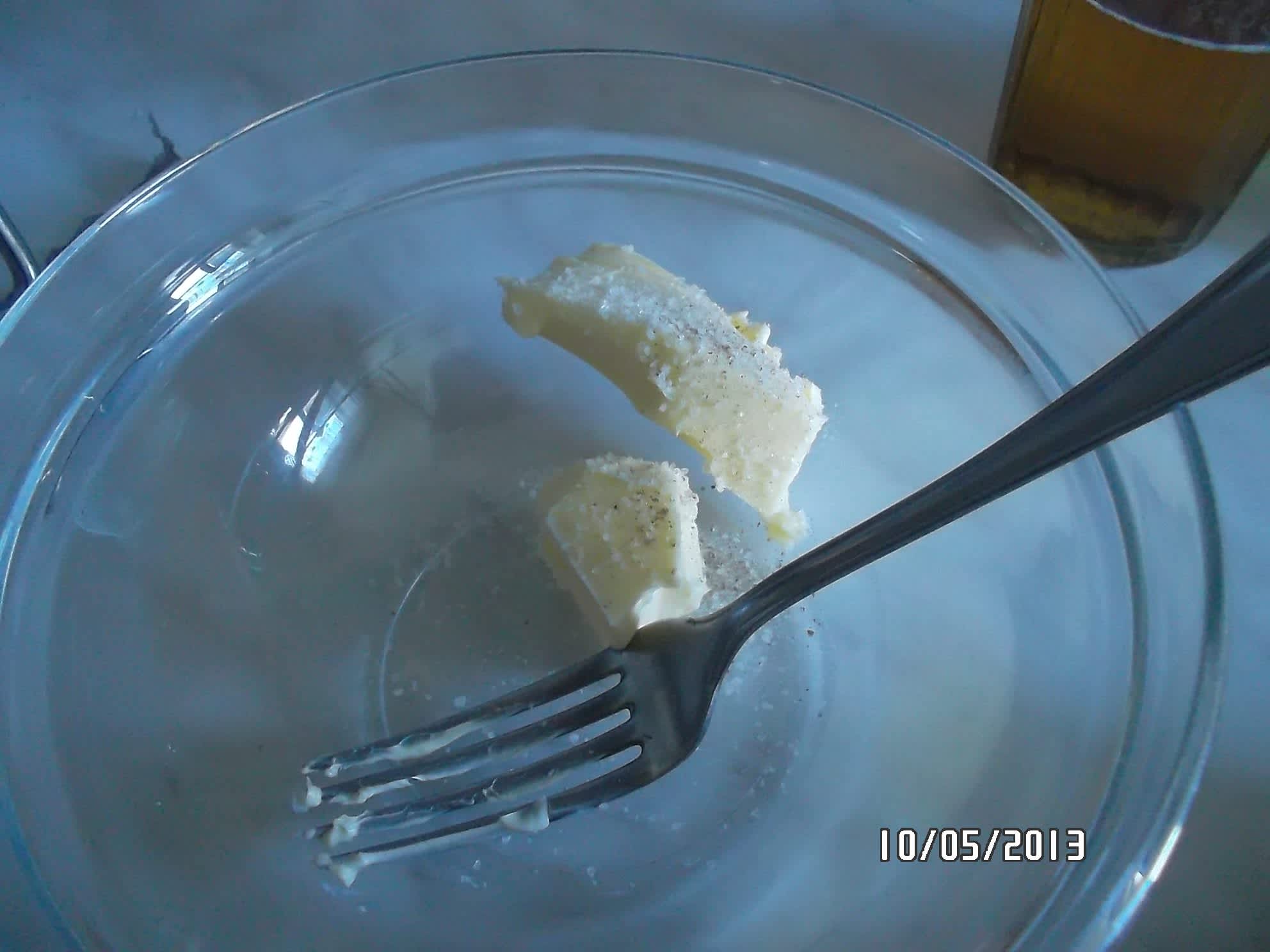 Na plněný hermelín začneme tím, že vytáhneme asi hodinu předem máslo z lednice, aby povolilo tak, že jde v pohodě rozmačkat vidličkou.