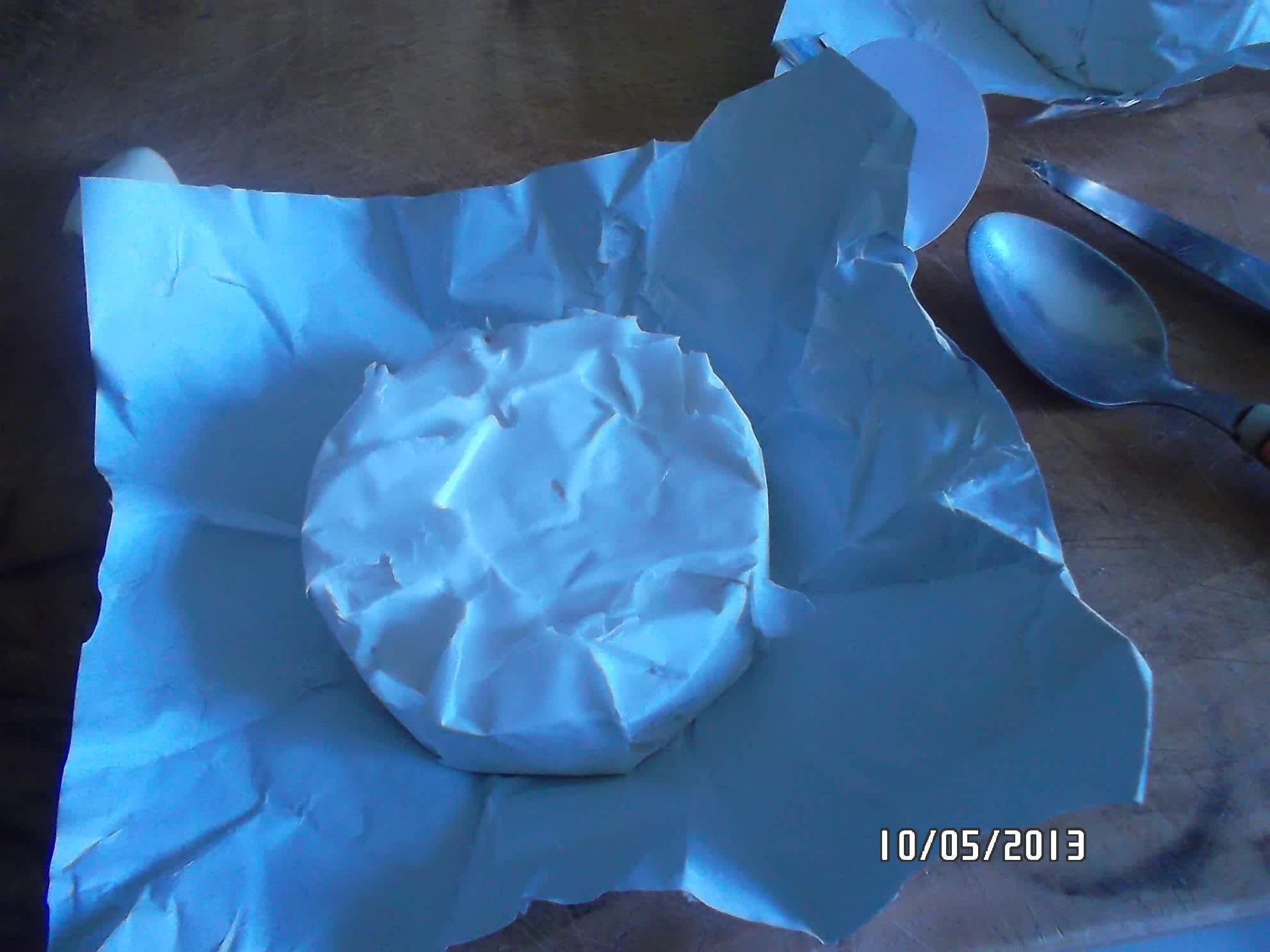 Vymíchanou směs lžičkou naplníme zpátky do půlek hermelínu, dobře natlačíme, protože vnitřku nám přibylo, slepíme půlky k sobě, zabalíme do původního obalu co nejpevněji a dáme aspoň na 2 hodiny, nejlépe však přes noc ztuhnout do ledničky.